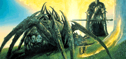 Ungoliant was a mighty and evil spirit who came to the world before the Trees of the Valar were made. She took the form of a giant spider and settled in the waste land of Avathar. After she had helped Melkor destroy the two trees of Valinor she demanded the stolen silmarils of him. When he refused she attacked him but when Melkor called forth the balrogs she was forced to flee in to the vast eastern deserts. It is said that she in her last hunger devoured herself .She is the mother of Shelob.